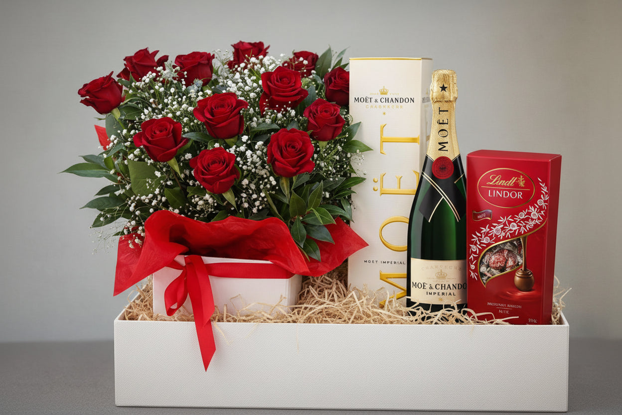 This elegant gift features a boxed arrangement of 15 premium red roses, styled with fresh seasonal foliage and delicate babyās breath. Paired with a bottle of MoĆ«t & Chandon Champagne and indulgent Lindt Lindor chocolates, this hamper is the ultimate romantic gesture to celebrate love.